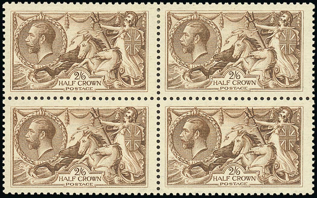 2/6d. reddish brown, block of four, original gum with the lower pair remaining unmounted mint, good colour and perfs., fine. S.G. 415, £970. Photo