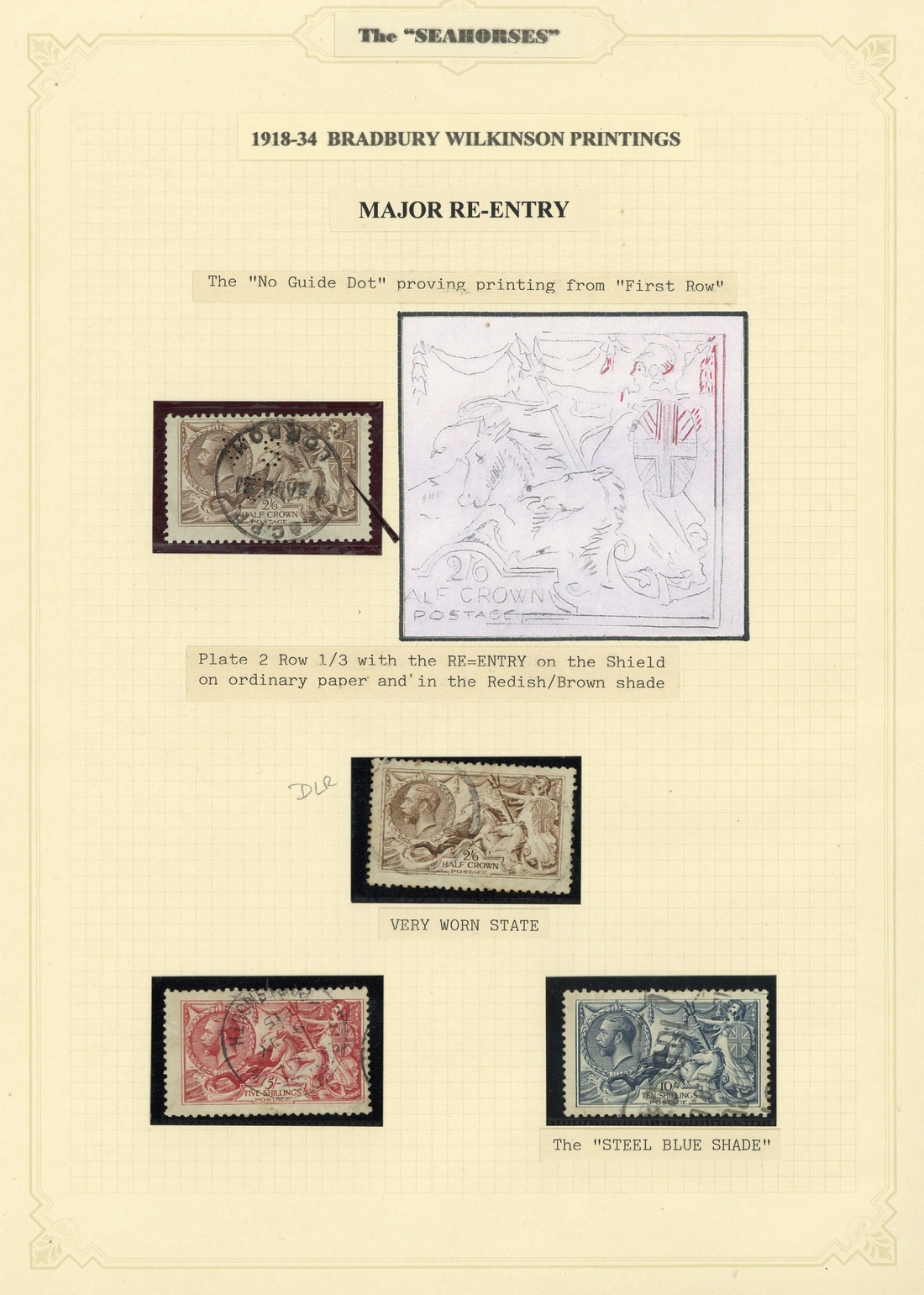 2/6d. (22 including block of four, [R1/3] and [R1/2] re-entries, 5/- (9 with two on pieces), 10/- (7, including two blackish-blue shades), used, mixed condition but fine included