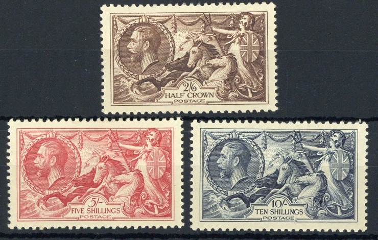 2/6d., 5/- and 10/-, unmounted mint, off-white gum; 10/- with a couple of patches of flat gum. S.G. 450-452, £575