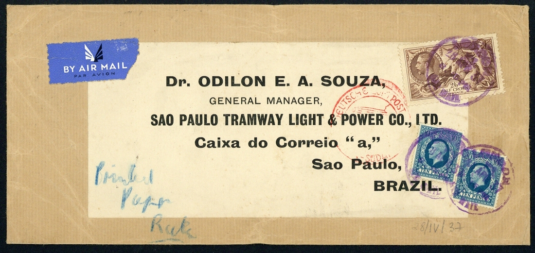 2/6d. with 1934 10d. (2) on cover dated 28 April 1937; 10/- with 1924 6d. on cover dated 8 Sept. 1937; 10/- with 1934 1/- (4) on cover dated 15 Sept. 1937. All to the same address in Brazil. Good to fine