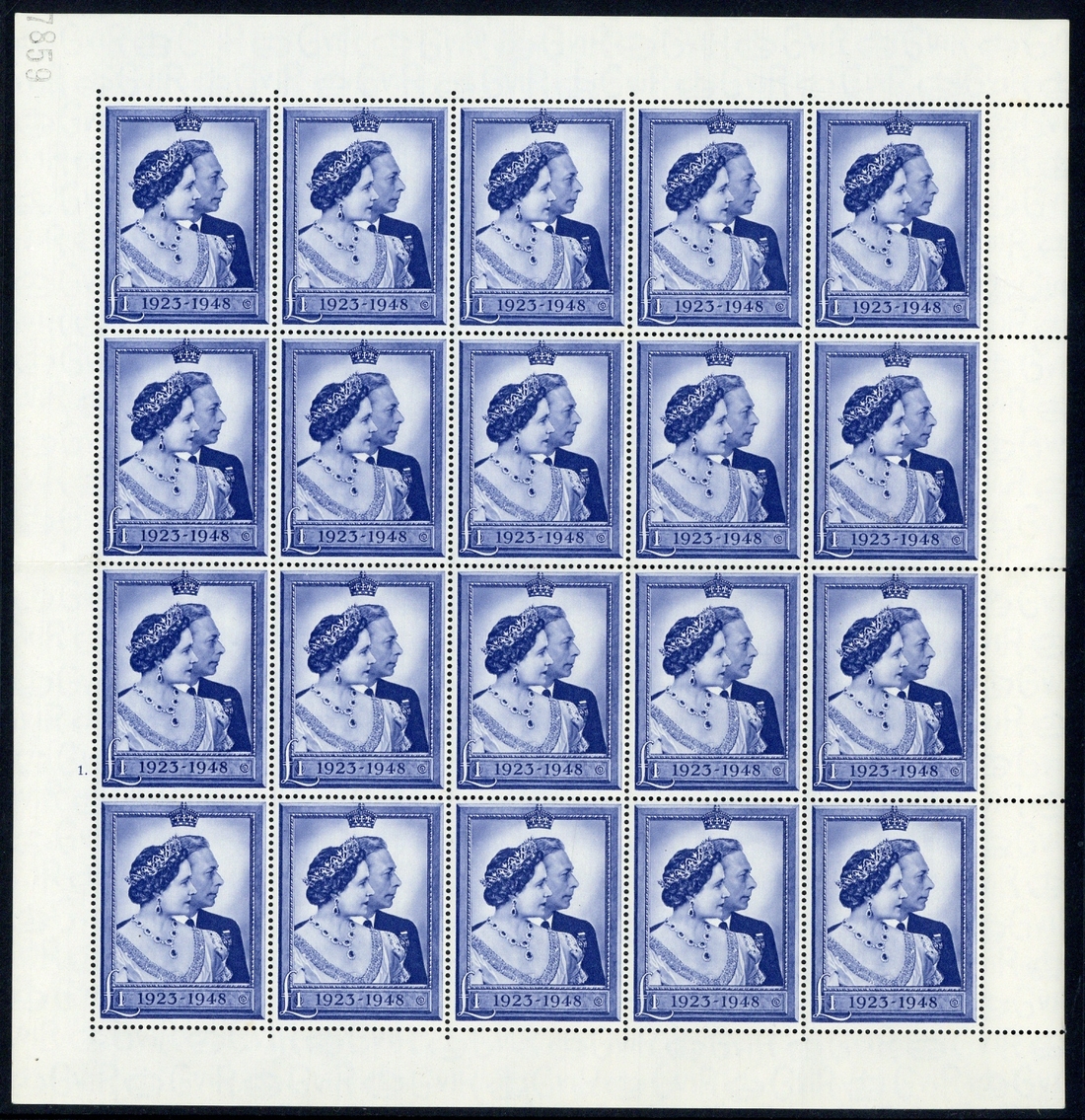 £1 blue, complete sheet of twenty (5 x 4), unmounted mint, some light bends or wrinkles, fine. S.G. 494, £800+