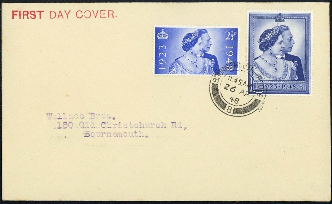 2½d. and £1 neatly cancelled on Wallace plain first day cover from Bournemouth addressed locally; fine. S.G. 493-494