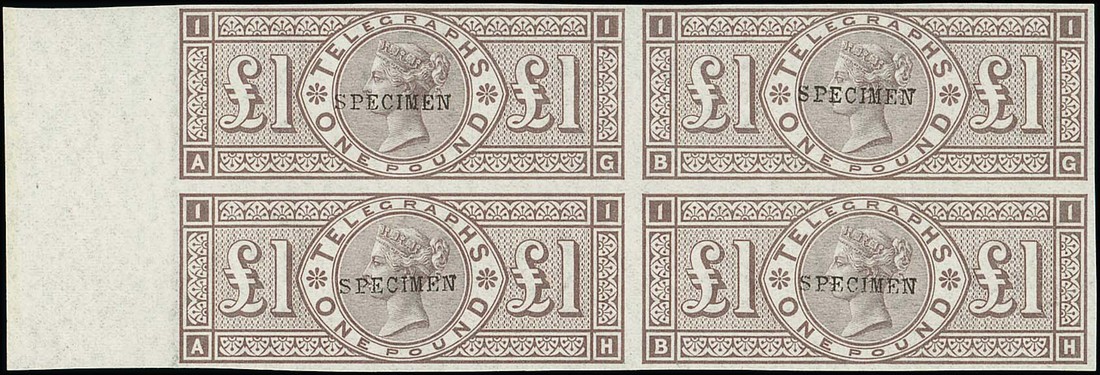 Brown-lilac, AG-BH, block of four from the left of the sheet, overprinted "specimen" type 9, unmounted mint, some diagonal bends or wrinkles, otherwise very fresh and fine. Specialised L236f, £5,200+. Photo