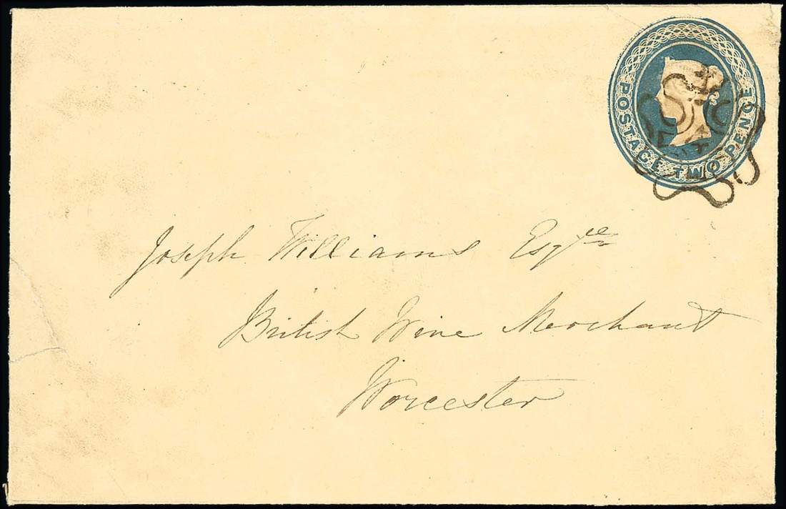 Only five 2d. embossed envelopes are recorded with number in Maltese Cross cancellations, this is the only one with number "4", and it is the earliest of all the recorded examples