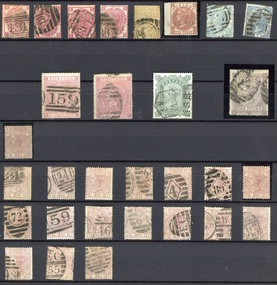An early to recent collection in two stockbooks which includes 1840 1d. black (3) and 2d. blue with touched to good margins, 1841 with some covers, Penny Plates used with block of eight mint, ½d. block of four unused; Embossed set of three with fair to good margins; a useful selection of Surface Printed including 1867-80 10d. handstamped "specimen" type 2, 1867-83 5/- (2) one cancelled "C30" of Valparaiso, 10/- (perfin) and £1 postally used with registered barred oval cancellation, 1873-80 1/- plate 13 unused, 1880-81 5d. unused, 1881 1d. lilac 14 dots mint strip of three, 1883-84 2/6d. and 5/- mint, £1 brown-lilac watermark Crowns and watermark Orbs used, Jubilee set unused and £1 used, a selection of Postal Fiscals; K.E.VII including 2d. block of four mint, 2/6d. mint plus used with values to 10/- and £1; K.G.V with 1912-24 values to 1/- mint, 1918 2/6d. mint, 1924-26 block cypher set mint, 1929 P.U.C to £1 mint (toned), 1934-36 set to 1/- mint; some useful K.G.VI including 1948 Silver Wedding £1 in a mint sheet of twenty, some Postage Dues and Q.E. with issues to 1980's plus a few first day covers and others. Condition is a little mixed in places, however, a generally clean and desirable general collection