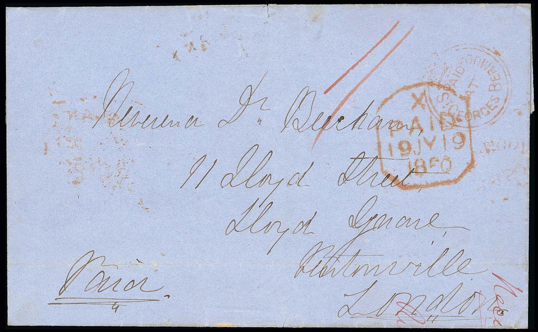1850 (3 July) entire from St. Georges to London, rated "11" and showing a good strike of the Crowned Circle at upper right corner, partially overstruck by arrival datestamp (19.7), the reverse with despatch and arrival datestamps. Rare with only seventeen of this handstamp recorded by Forland and Freeland, and the only example recorded in this year. S.G. CC1, £8,500. Photo
