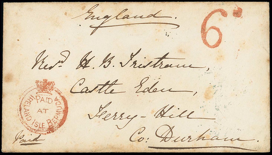 1859 (8 Sept.) envelope from Ireland Isle to England, marked "Paid" and showing a fine strike of the Crowned Circle at lower left corner and an equally fine strike of the "6d" handstamp at upper right corner, the reverse with despatch c.d.s. (PM5), Ferry Hill (4.10) and Castle Eden (4.10) c.d.s.; some minor traces of foxing in places though an attractive example of this rare handstamp, and the first example recorded by Forland and Freeland showing the "6d" handstamp. S.G. CC2, £7,500. Photo