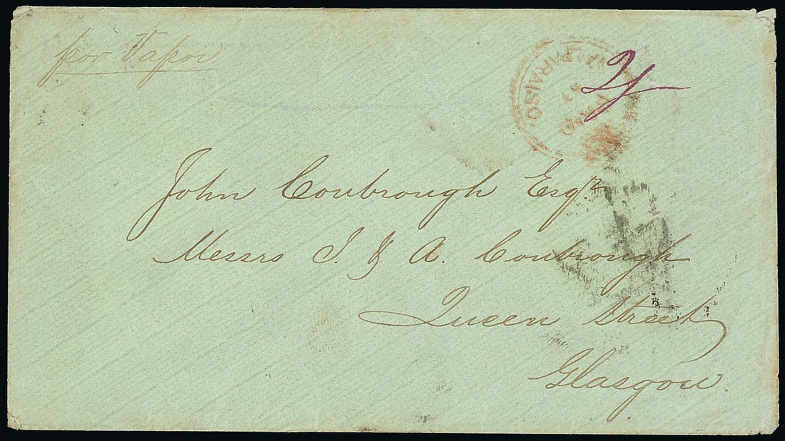 1868 (3 May) pale green envelope from Valparaiso to Glasgow, marked "Per vapor" and rated "2/-" with a legible strike (with stop) of the Crowned Circle over rate mark, the reverse with legible despatch datestamps and arrival c.d.s. (14.6). S.G. CC2, £500. Photo
