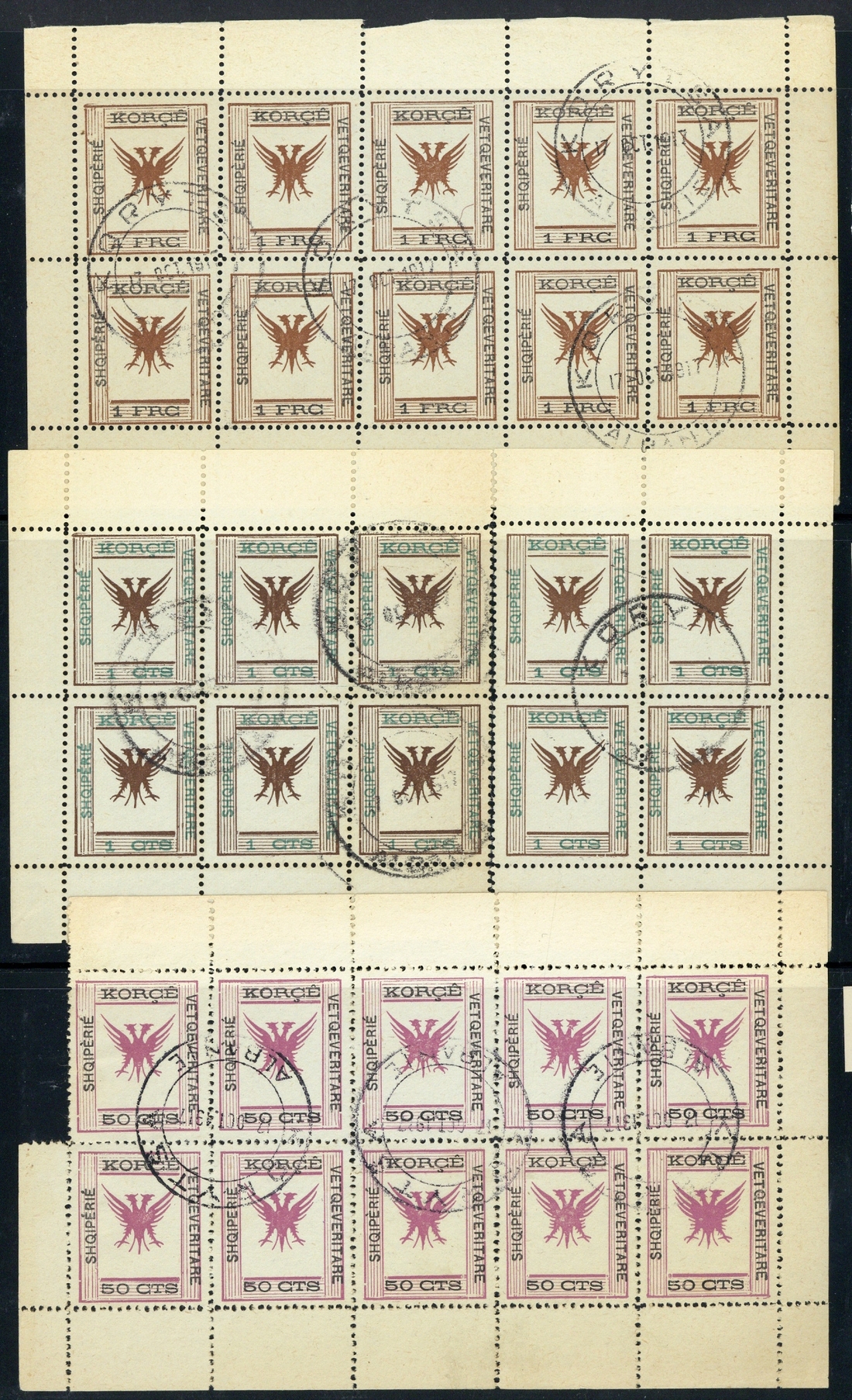 1917 Double Eagle Vetqeveritare and Republica Shqipetare issues, a duplicated used selection, including first issue with values to 1f. (50 with two sheets of ten), second issue with values to 1f. (82 with four sheets of ten), annotated forgeries, etc., chiefly fine