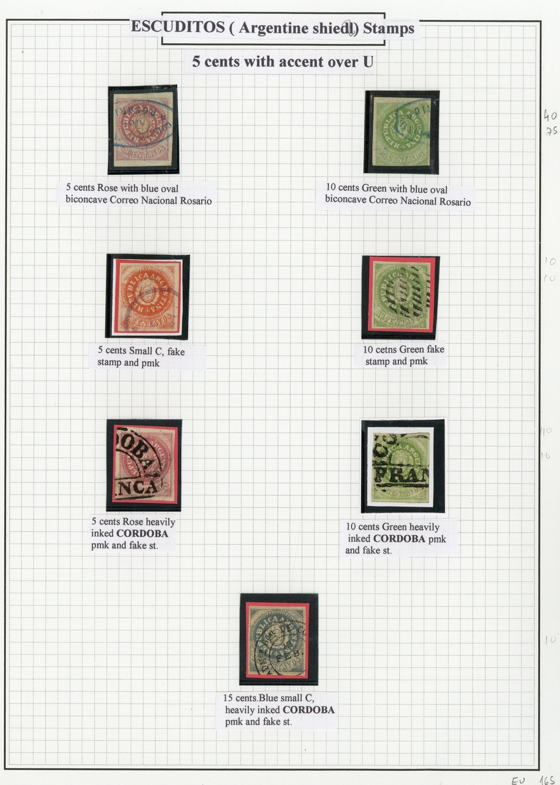 1862 with accent on "u" of "republica" 5c. rose and 10c. green, both with blue Rosario cancellation; 1864-67 perforated Rivadavia 5c. (7), 10c. (3, one with perfs. trimmed), 15c. (3), mixed condition, also five forgeries or forged cancellations