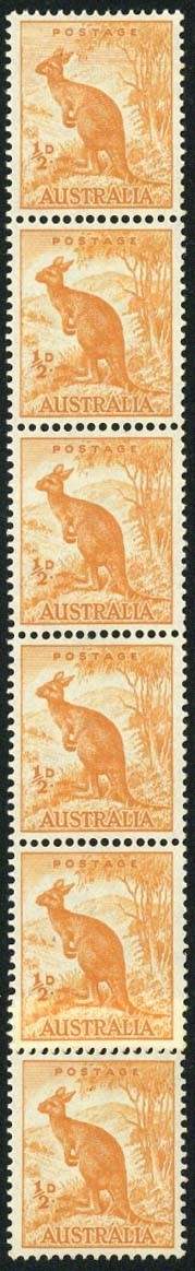 1948-56 no watermark ½d. orange coil strip of six, the top stamp showing sky retouch and the bottom pair with coil join, fine unmounted mint. S.G. 228/228cb, £325+