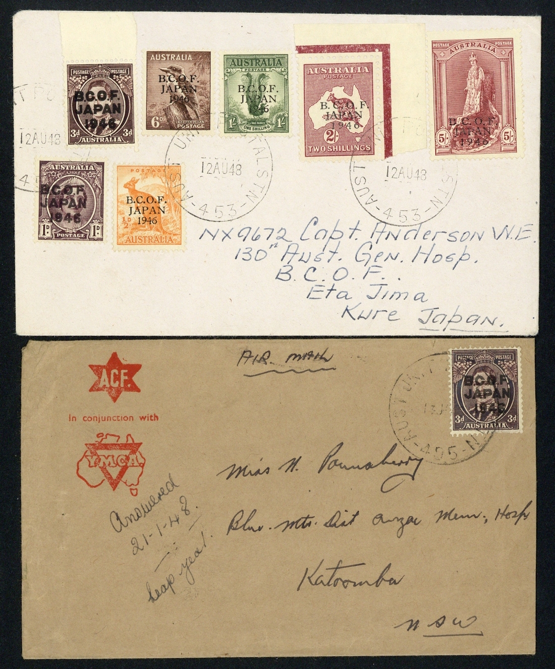1948 (12 Aug.) envelope to Japan, bearing 1946-48 ½d. to 1/- set of seven (5/- on thick paper) all neatly cancelled by 453 Unit Postal Station c.d.s.; also 1948 YMCA envelope to Australia bearing 3d. with 495 Unit Postal Station c.d.s.