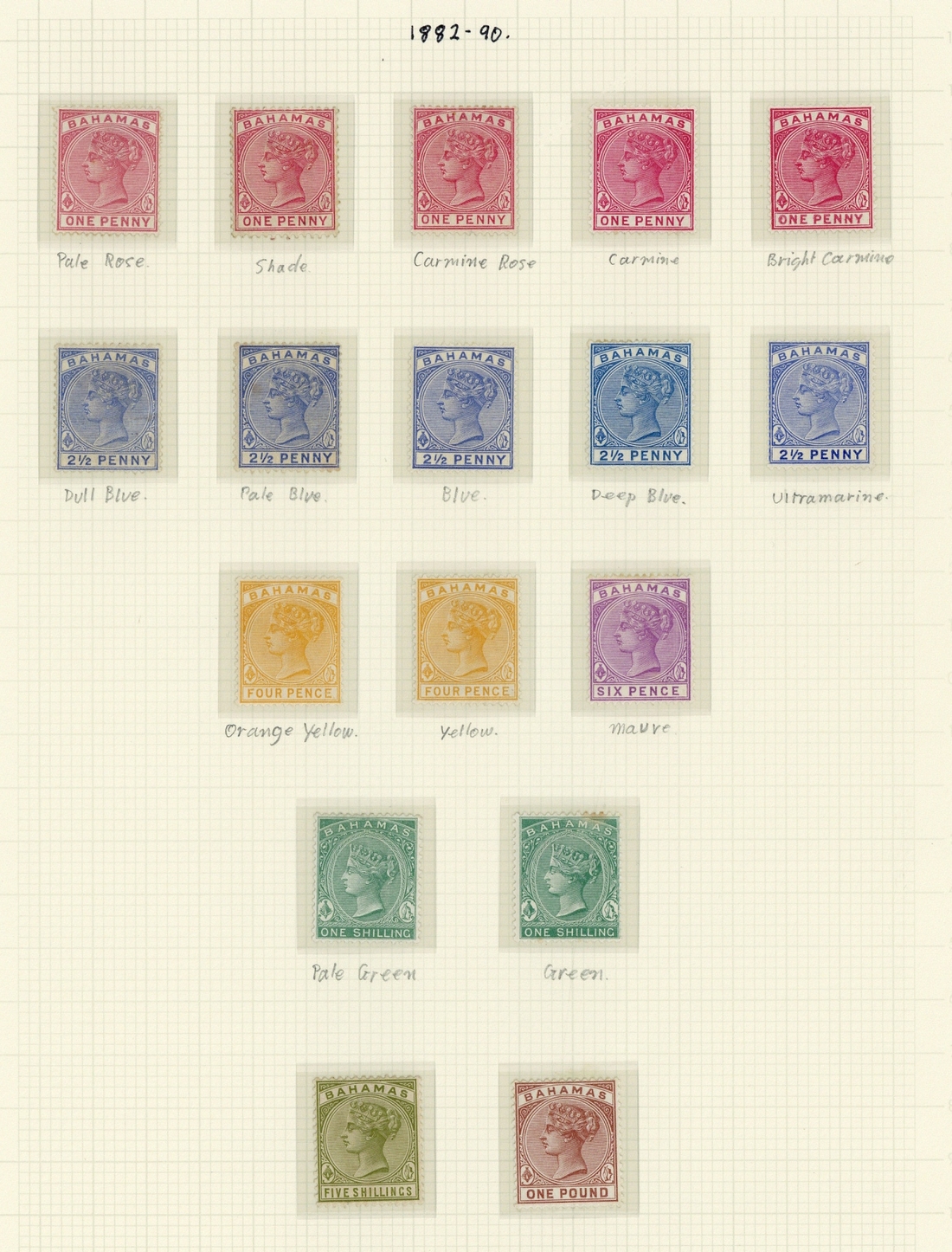 1884-90 1d. to £1 set of six with a few shades to 4d., 2½d. with sloping "2" (and a used example) and 6d. malformed "E", part original gum; 5/- toned and both 2½d. varieties with corner creases. Viewing recommended. S.G. 47-57 group, £780+