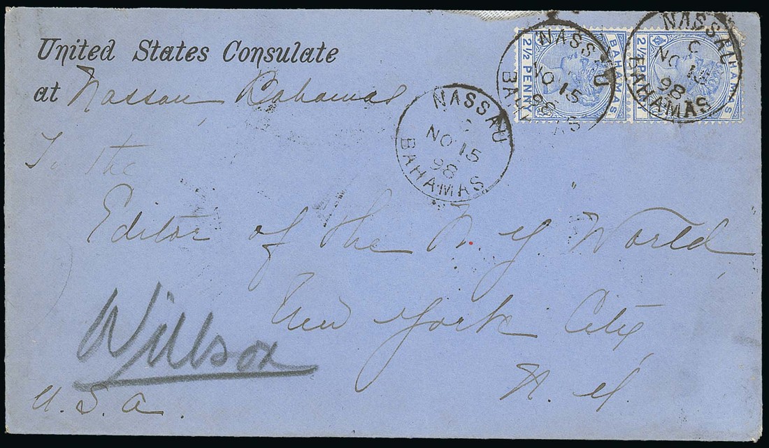 1898 (15 Nov.) envelope to New York with printed "United States Consulate/at" at upper left, bearing 1884 2½d. vertical pair placed sideways and tied by "nassau/bahamas" c.d.s. Neat and attractive. Photo