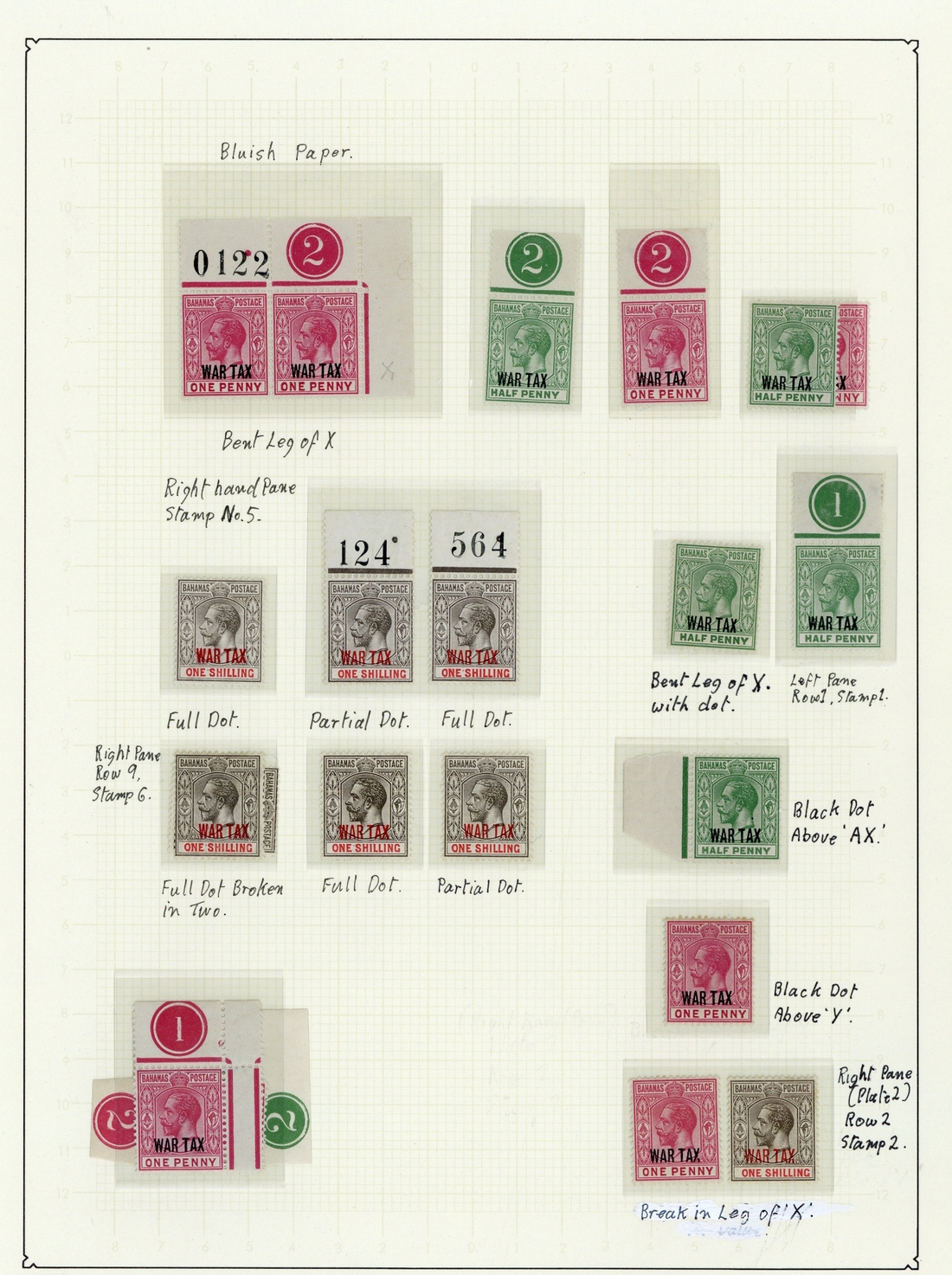 1917-19 War Tax specialised mint collection with a number of large multiples, plate varieties, etc., including 1918 (Feb.-July) 1d. complete sheet (some perf. separation), 1/- (2), 1918 (July) set of four overprinted "specimen", ½d. and 1d. left and right half sheets of each, and 1919 (July) set of four overprinted "specimen", ½d. and 1d. (2) left half sheets of sixty, 3d. block of four and a single with watermark inverted and reversed, generally good to fine