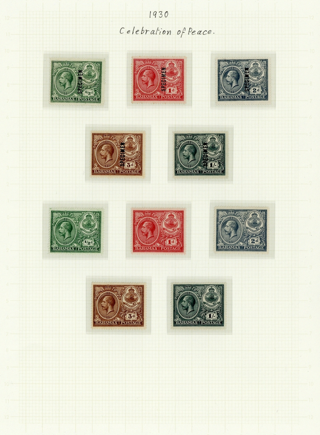 1920 Peace set (2, one overprinted "specimen"), 1930 Tercentenary set (2, one perforated "specimen"), 1931-46 2/- (5) and 3/- (5) with one of each perforated "specimen", 1935 Jubilee set (4) and 1935 8d. (4, one perforated "specimen"); generally good to fine mint. Cat. £750+