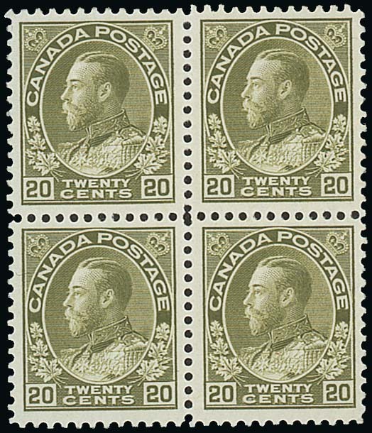 1912-22 20c. olive block of four, nicely centred and fresh mint with only the upper right stamp having been previously hinged; most attractive. S.G. 213; Unitrade 119, $1,050+. Photo