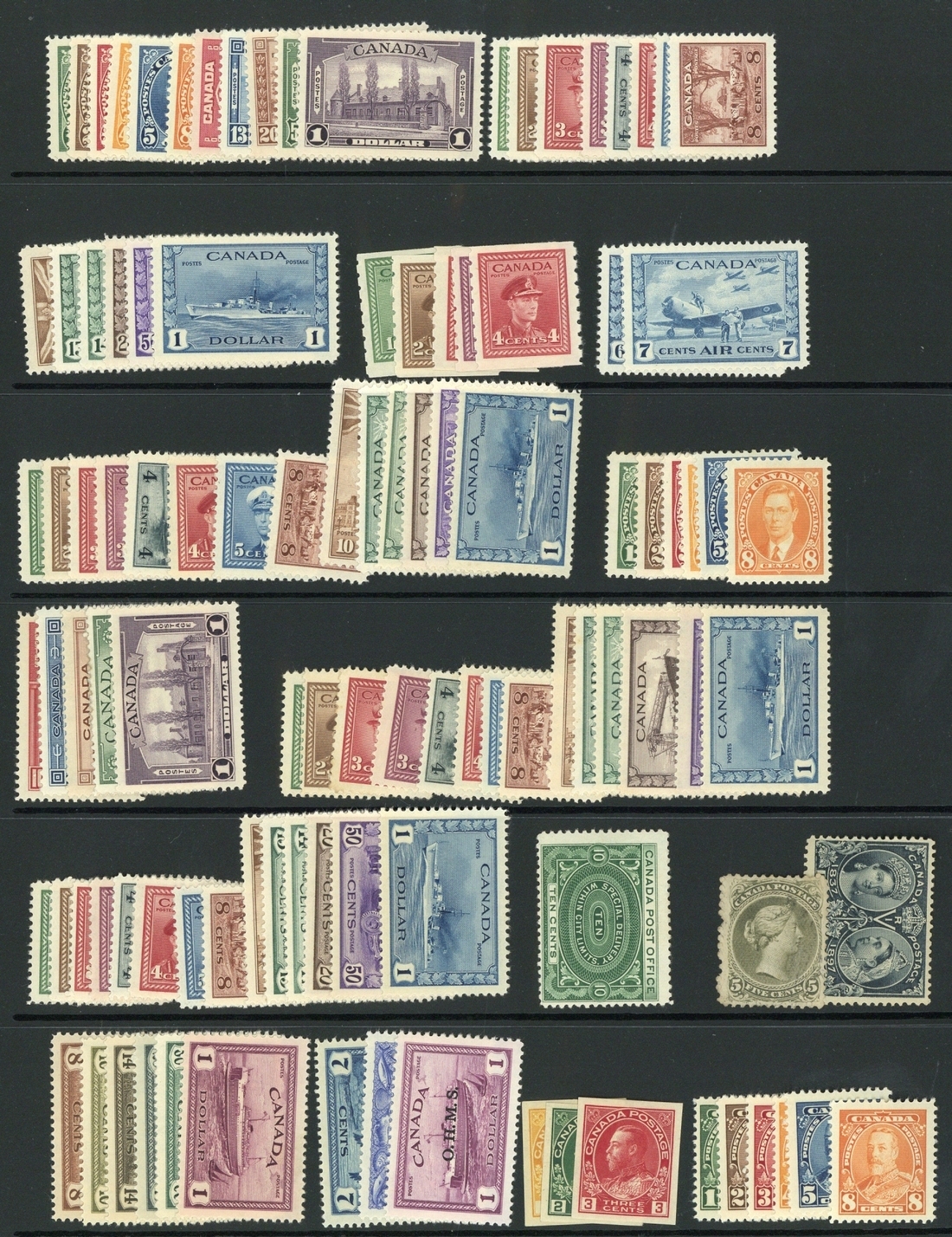 1922-53 mint selection including 1932 Ottawa 6c. on 5c. and 1933 Grain 20c. blocks of four, 1935 set of eleven, 1937-38 set of eleven (2), 1942-48 War Effort set of fourteen (5), 1946 Peace set, a few later plate blocks and Official 1946 $1 and 1951 $1; fine with some unmounted