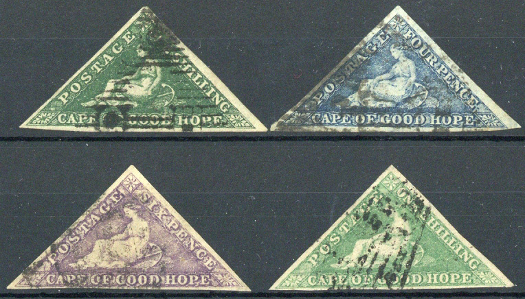 4d. blue (towards steel), 6d. bright mauve, 1/- bright emerald-green and 1859 1/- deep dark green, all with clear or good to large margins; the last with a crease, otherwise sound