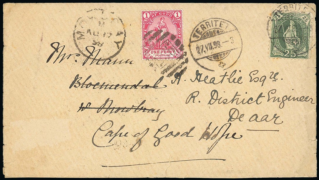 1898 (27 July) envelope from Territet, Switzerland to Bloemendal near Mowbray bearing 25c. green with c.d.s., upon arrival redirected to De Aar and bearing 1d. carmine cancelled "965" with Mowbray c.d.s. alongside, the reverse (flap missing) with sender's cachet and four transit c.d.s., all overlapping. Most attractive. Photo