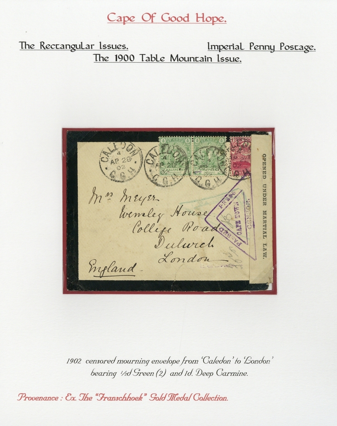 1902 mourning envelope from Caledon to London, bearing ½d. (2) and 1d. with c.d.s. and showing censor label at left tied by Cape Town censor label in violet. Also 1903 (19 Feb.) p.p.c. (Adderley Street) to Bohemia bearing 1900 1d. carmine cancelled by a good strike of "k.u.k. kriegmarine/zenta" c.d.s and 1900 4d. registered envelope uprated with 1d. (2), from Port Elizabeth to Queenstown and 1901 envelope from Volstruisnek addressed locally to "The Camp" bearing 1d. with c.d.s.
