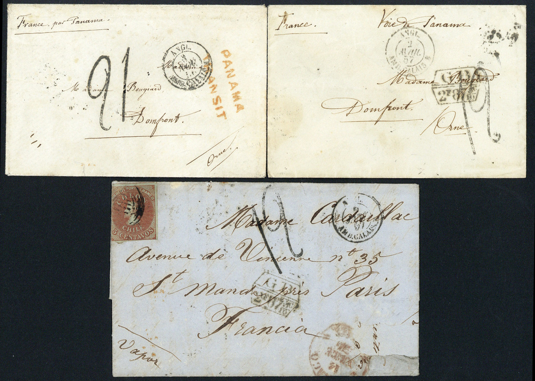 1856 stampless envelope with "21" rate handstamp and red "panama/transit", 1856 (8 Dec.) entire letter, franked 5c. (cut into at left) with "12" rate handstamp and "GB/2f 87 5/10c." (Salles 3042), 1857 (1 Feb.) stampless envelope with "12" rate handstamp, "GB/2f. 87 5/10c." (Salles 302), all to France, a variety of transit and arrival datestamps; fair to fine