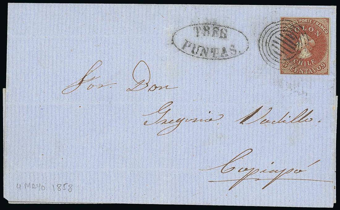1858 (4 May) entire franked 1855 second London printing 5c. brown-red, margins all round, with concentric circles cancellation with "tres/puntas" in oval alongside; vertical filing fold well clear of the adhesive, fine and scarce. Photo