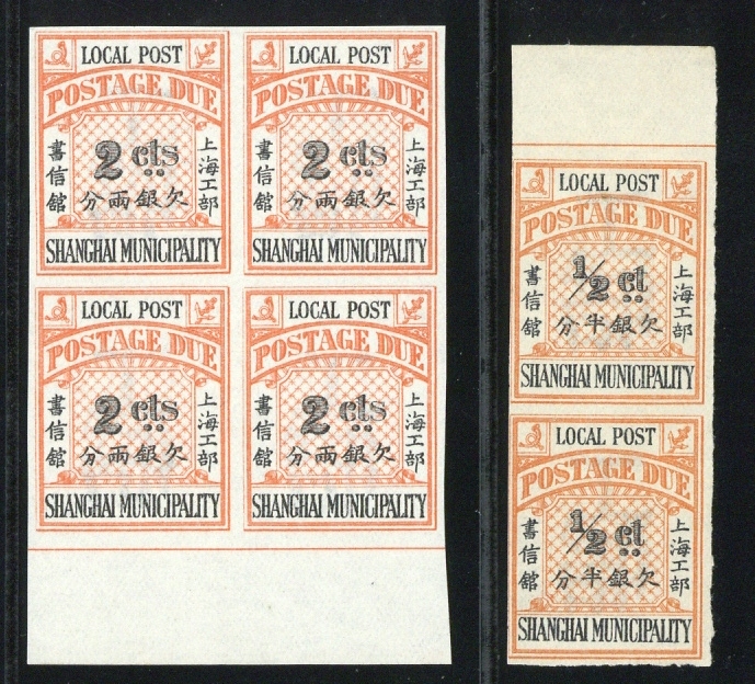 1893 Postage Dues, ½c. top margin vertical pair and 2c. lower margin block of four, imperforate plate proofs; ½c. on gummed paper