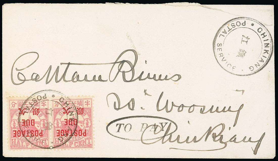 1895 Postage Due ½c. rose-red, variety overprint inverted, a horizontal pair tied by Chinkiang Postal Service cancellation on Binns envelope with a second strike of the postmark at top (another on the reverse) and oval "to pay". Fine. S.G. D24a. Photo