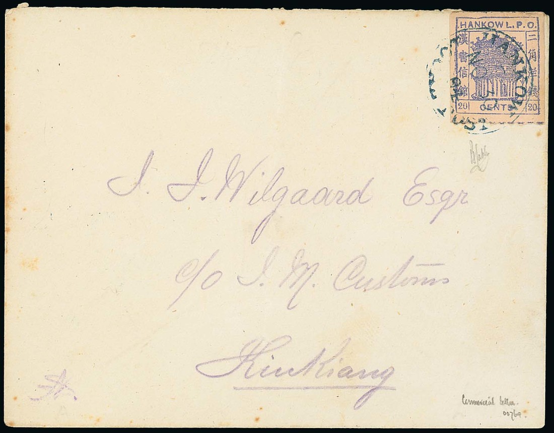 1894 (Oct. - Nov.) two local Wilgaard covers each bearing 20c. deep blue on pale cinnamon, tied by Hankow Local Post c.d.s. in blue with the arrival c.d.s. on the reverse. One with part flap missing and the other with vertical fold, some light age marks. One signed by Peter Holcombe "Commercial letter". Photo