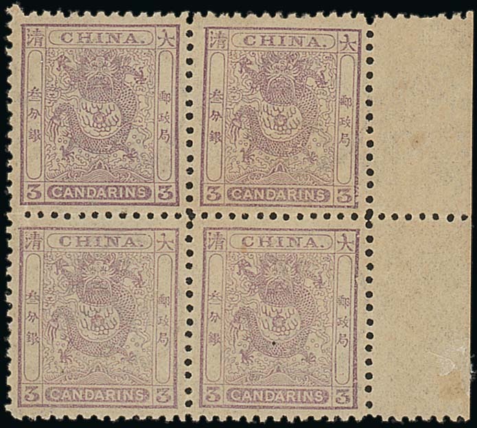 Perf.11½; 3ca. mauve, right margin block of four, part original gum. S.G. 14, £1,200. Photo