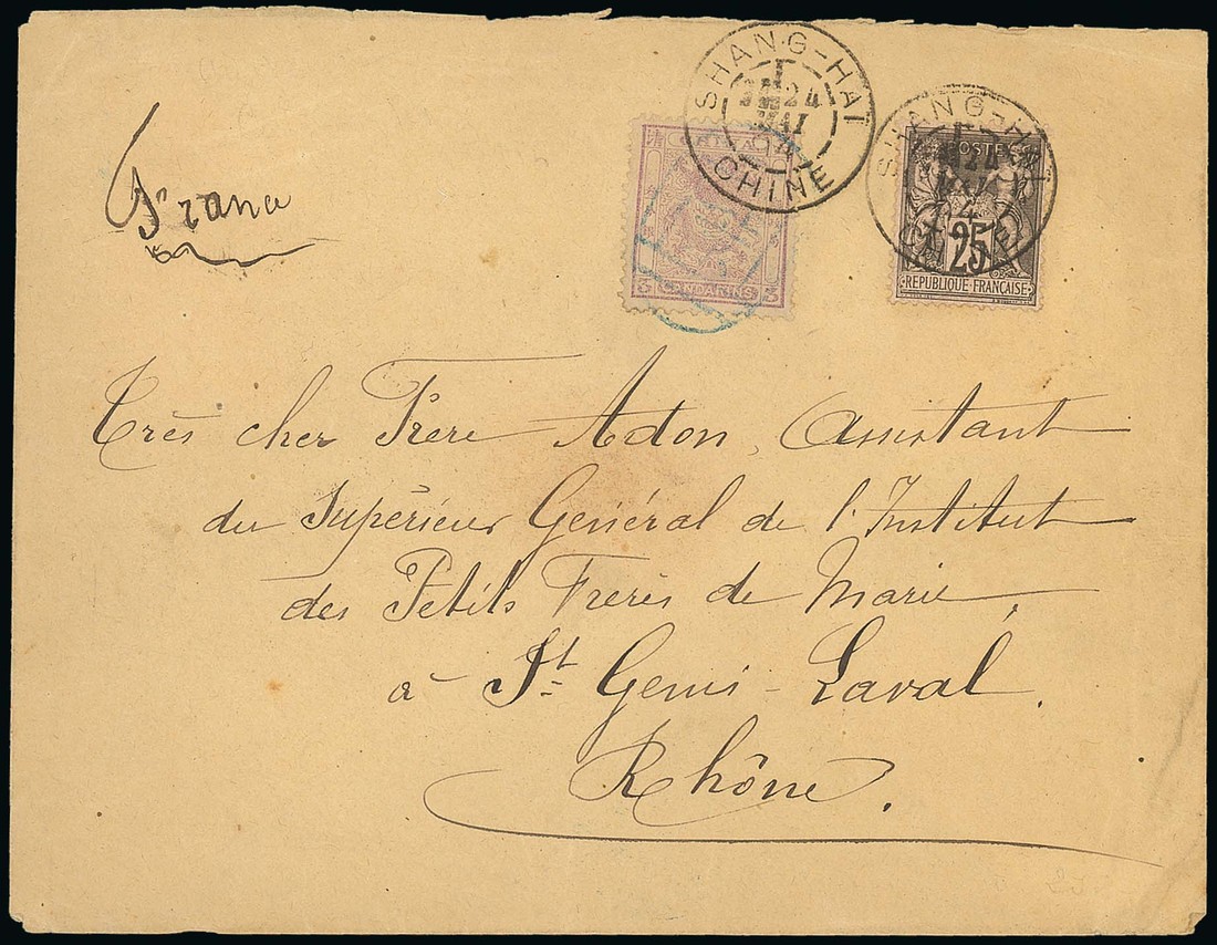1894 (17 May) envelope to France bearing 3ca. tied by Peking seal in blue with France 25c. alongside, both stamps tied by "shang-hai/chine" c.d.s.. the reverse with Peking, Tientsin and Shanghai Customs c.d.s. and St. Genis-Laval arrival (1.7); some trivial soiling does not detract from this good cover. Photo