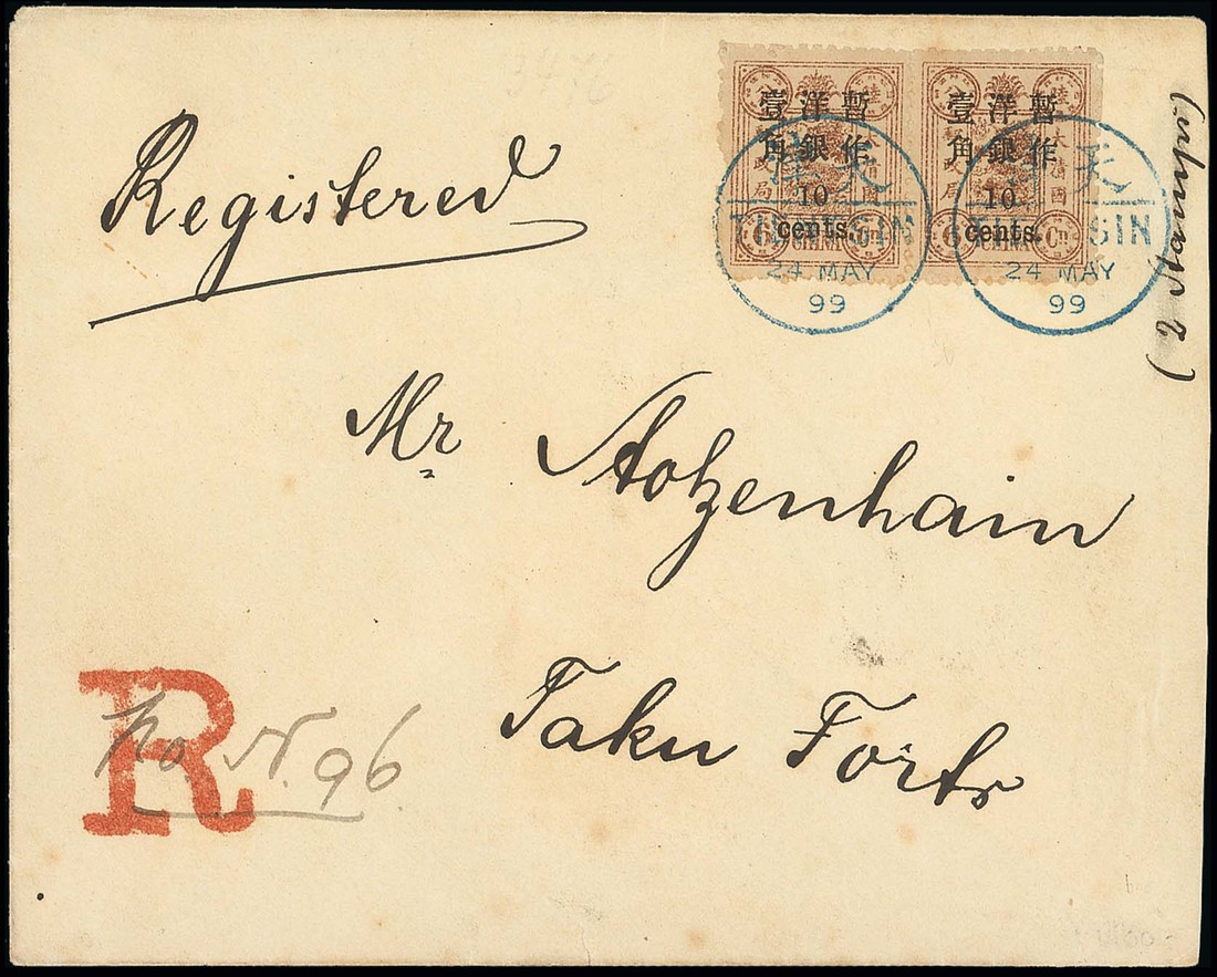 Small Figures: 1899 (24 May) envelope addressed to Taku Forts bearing pair of 10c. on 6ca. reddish brown tied by Tientsin bilingual c.d.s. in blue with the large handstruck "R" in red in the lower corner; the reverse with Taku bilingual dater (24.5). A fine and attractive cover and early use of both of the bilingual daters. Photo