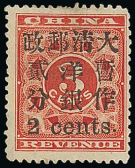 Small Figures: 2c. on 3c. red [1] showing broken "n", unused without gum; very slight thinning. S.G. 93, £850. Photo