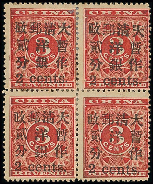 Small Figures: 2c. on 3c. red block of four [5/16] including comma and inverted "s", lower right stamp with character yen almost omitted; part original gum. The stamps are centred low and right and there are some reinforced perforations and a few minor thin spots; good colour and a good block. Photo