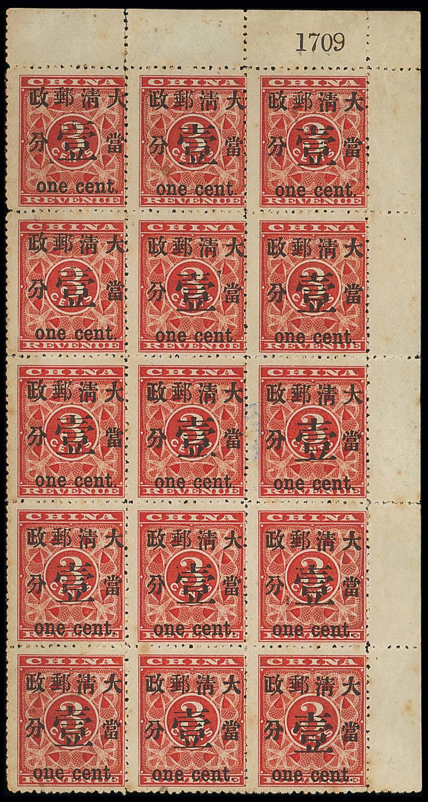 Large Figures: 1c. on 3c. red in a sheet number "1709" block of fifteen [3/25], large part original gum; a single hinge reinforcement in the margin and light toning and soiling. A desirable sheet number block with several stamps unmounted. Photo