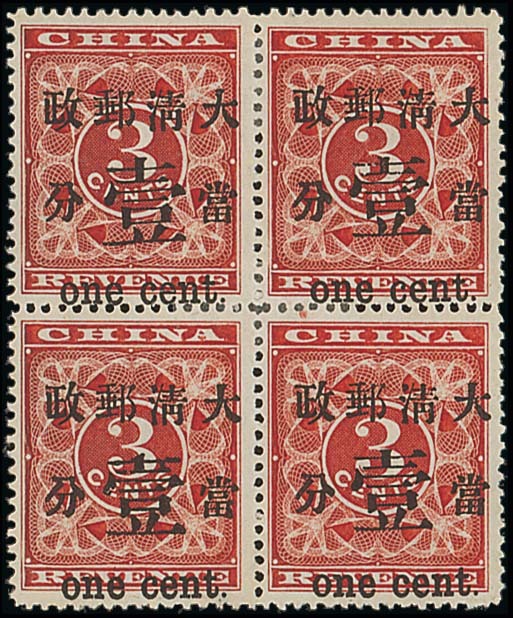 Large Figures: 1c. on 3c. red [16/22] block of four, variety surcharge printed low, part original gum with two hinge remainders; fresh appearance and a good variety. Photo