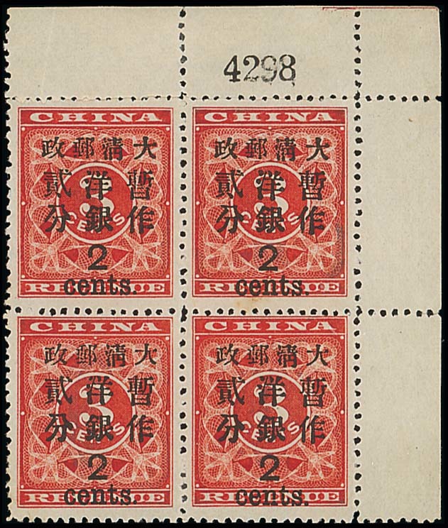 Large Figures: 2c. on 3c. red [4/10] in a corner sheet number "4298" corner block of four, unused without gum; the horizontal perforations at top appear to have been rejoined. Well centred with brilliant colour. Photo
