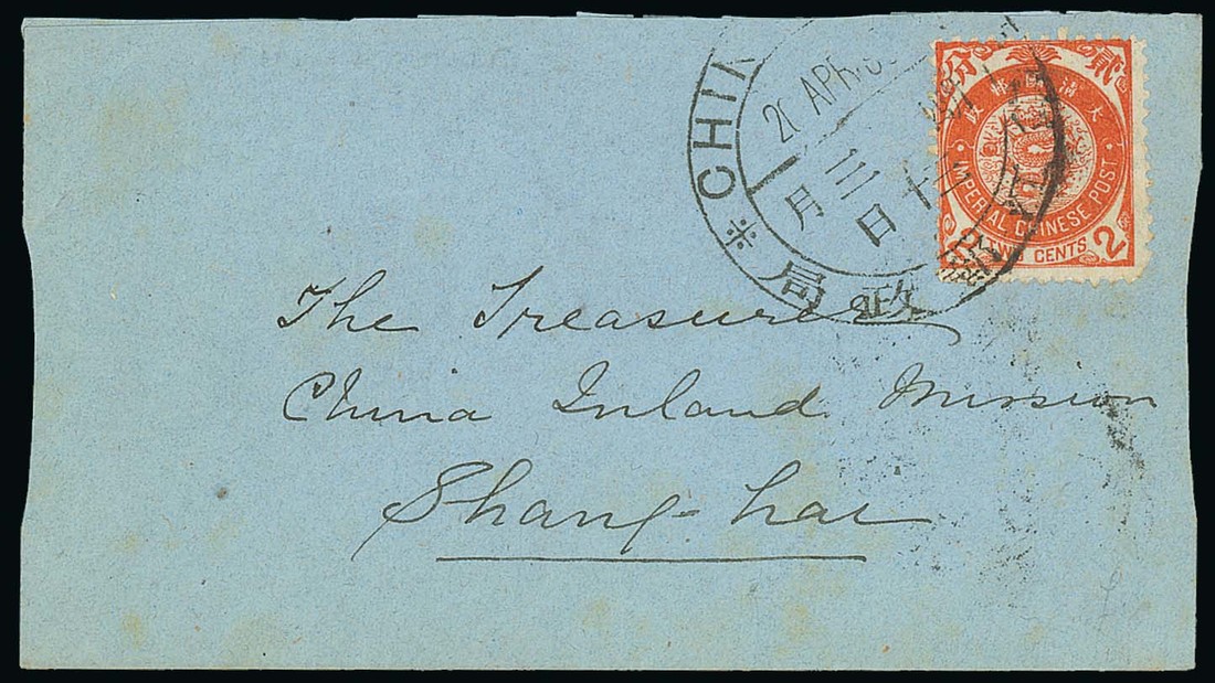 1898 (20 Apr.) neat blue envelope to Shanghai bearing 2c. deep orange tied by a good strike of the Chinkiang Dollar chop, the reverse with Shanghai Local Post arrival c.d.s. (21.4). A fine example of this fairly scarce postmark. Photo