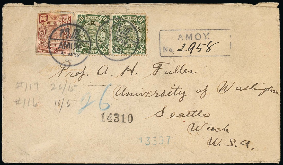 1905 (3 Nov.) envelope registered to Seattle bearing 10c. green (2) and 20c. claret tied by Amoy bilingual c.d.s. with a good strike of the boxed Amoy registered handstamp alongside, the reverse with Hong Kong (6.11), San Francisco (5.12) and arrival c.d.s.; some minor soiling. Photo