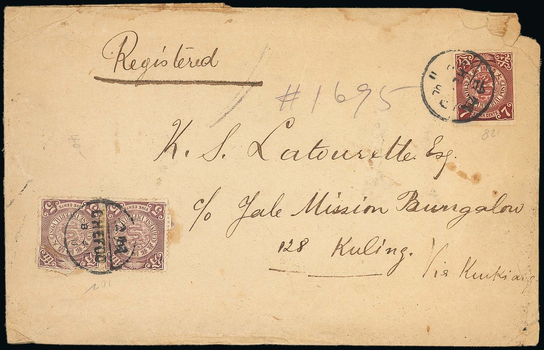 1911 (8 July) large commercial envelope registered to Kuling "Via Kiukiang" bearing 5c. mauve pair with 7c. crimson-lake tied by Chefoo bilingual c.d.s., the reverse with Kiukiang bilingual c.d.s. and Kuling lunar arrival; soiled. Photo