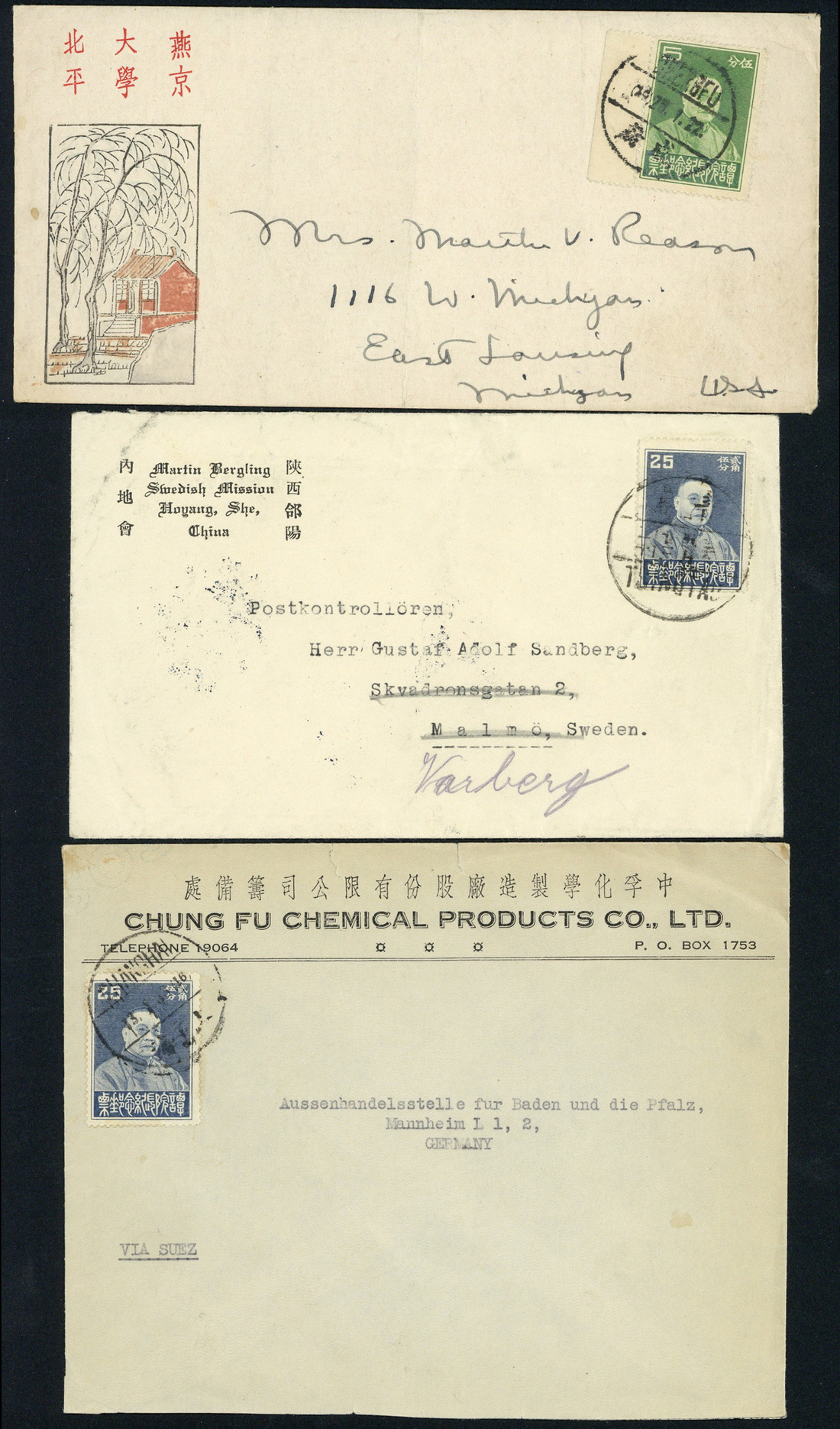 1933 Tan Yen-Kai Memorial, commercial covers with 5c. on cover from Seengfu to U.S.A., 25c. on cover from Shanghai to Germany via Suez and 25c. on cover from Tsingtao to Sweden; good condition. (3 covers)