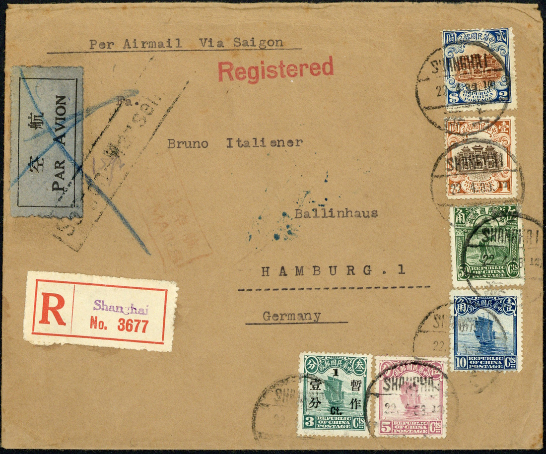 1933 (22 Apr.) air mail envelope registered to Germany bearing $3.66 franking tied by Shanghai c.d.s., with "Par Avion" etiquette and Shanghai registration label with boxed "Saigon - Marseilles" handstamp, the reverse with blue Saigon transit c.d.s., Haiphong and Hamburg arrival