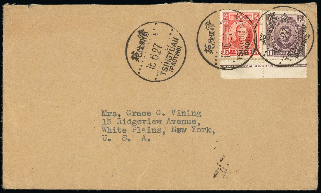 1938 (16 June) envelope to New York bearing Sun Yat Sen 15c. (defective) and Martyrs 10c. (with imprint) tied by Tsingyuan c.d.s., the reverse with Tientsin machine postmark and boxed censored handstamp in red. Photo