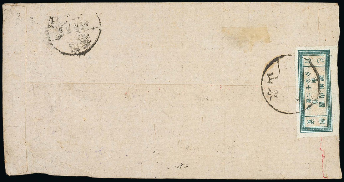 1941 Registration Stamp; 1943 (Apr.) envelope from Shantung province bearing, on the reverse, the blue-green and buff label tied by the despatch c.d.s. with transit and arrival c.d.s. on the address side along with the registration number. Photo
