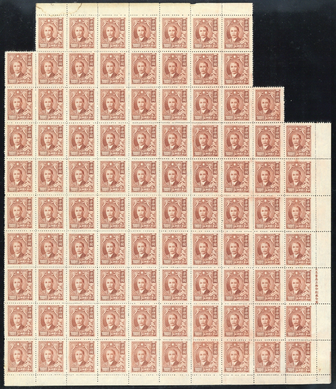 1947-48 Sun Yat Sen and plum blossom; $7000 red-brown in blocks of 80 and 94, one showing the corner plate "7"; without gum as issued. S.G. 964