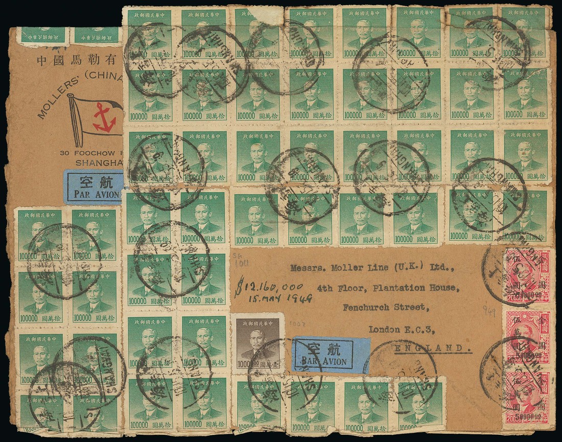 Gold Yuan: 1949 (15 May) large commercial envelope sent air mail to London bearing $12,160,000 franking which includes 1949 $100,000 (120) cancelled by large Shanghai c.d.s.; peripheral faults. A good, high franking. Photo