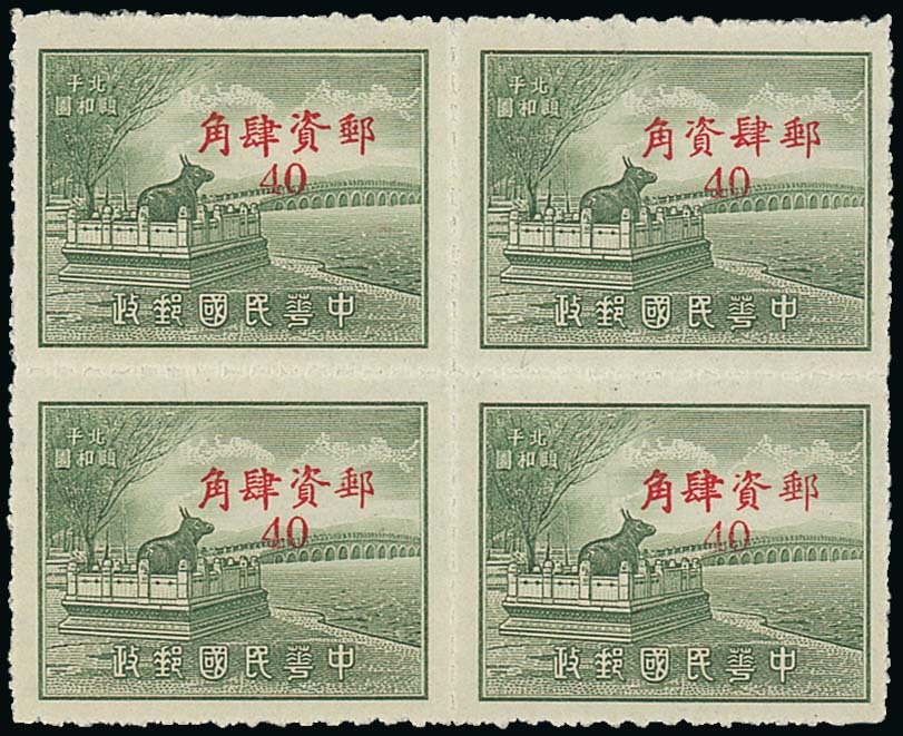 1949 Silver Yuan: Peking Views 40c. grey-green in a block of four, unused without gum as issued. Fine S.G. 1359. Photo