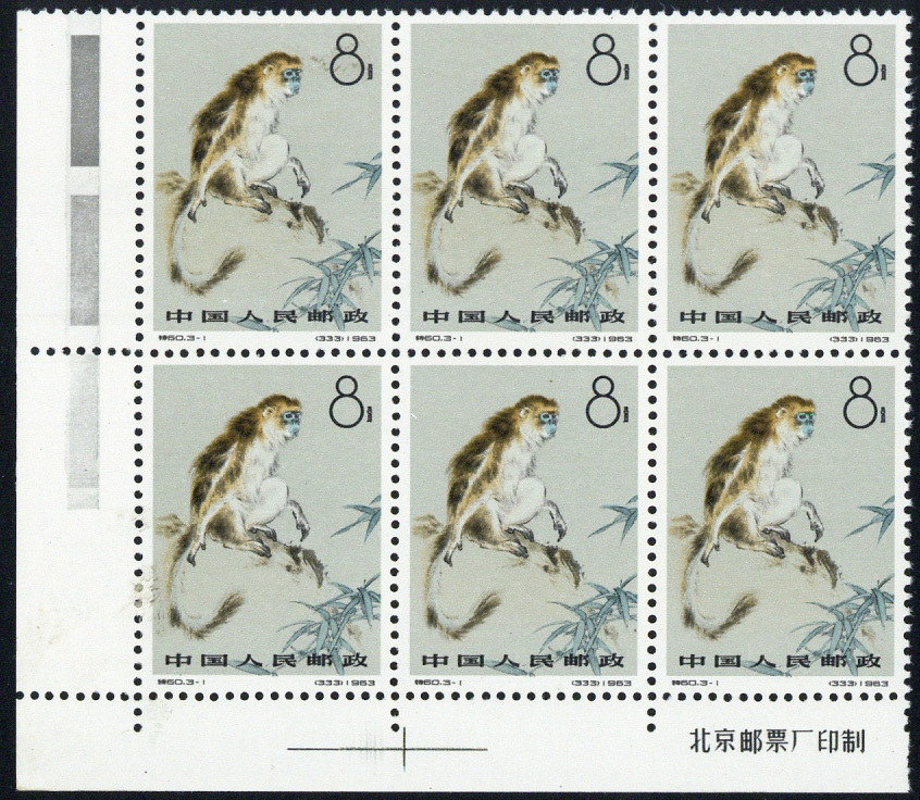 1963 Monkeys (S60) set of three in corner imprint blocks of four; small paper adherence on one, otherwise unmounted mint. S.G. 2121-2123, £270