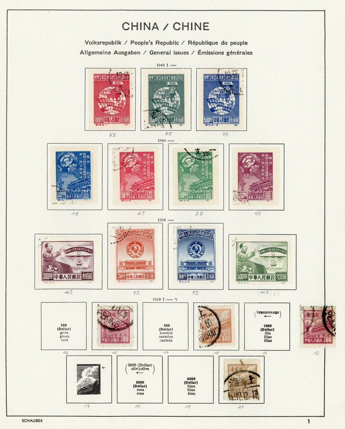 1950-66 a used collection of People's Republic on Schaubek leaves which includes reprints of the first issues, 1954 Russian Exhibition (2), 1958 Heroes monument miniature sheet, Kuan Han-Ching miniature sheet, 1959 Tenth Anniversary of People's Republic, 1960 Goldfish, Dr. Norman Bethune, 1960-61 Chrysanthemums, 1962 Support for Cuba, 1963 Cuban Revolution, Butterflies, Children set imperforate, Hwangshan Mountains, Monkeys imperforate, 1964 Peonies, 1965 Mountaineering, People's Liberation Army, and others. Clean and fine